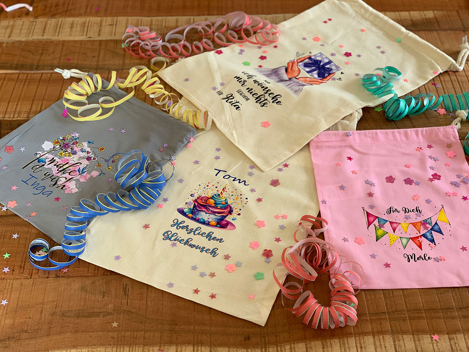 Stöbere durch unsere Auswahl und verleihe deinen Geschenken mit unseren individuell bedruckten Beuteln eine ganz persönliche Note. Es ist nicht