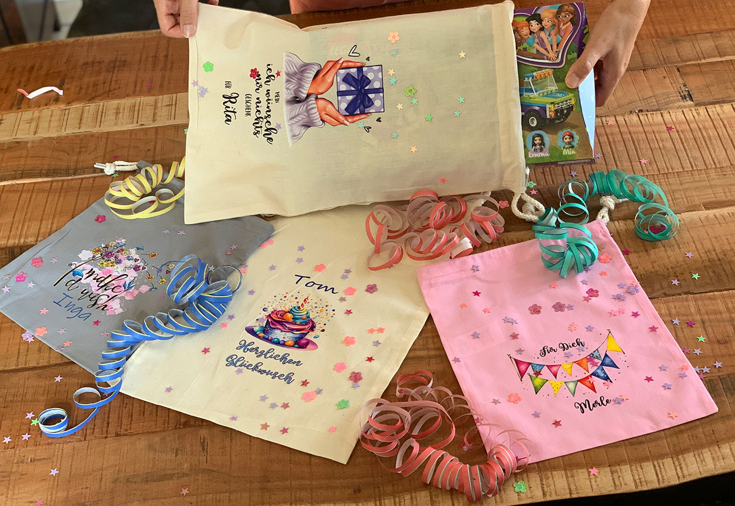 Mit Hilfe unserer modernen DTF-Drucktechnologie kannst du jeden Beutel zu einem Unikat machen. Mithilfe unseres Onlinekonfigurators kannst du dein Motiv personalisieren, wie du es wünschst. So wird die Verpackung selbst zu einem Teil des Geschenks und bleibt vielleicht sogar als liebevolles Erinnerungsstück erhalten.