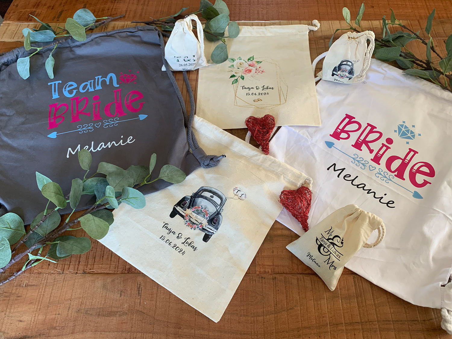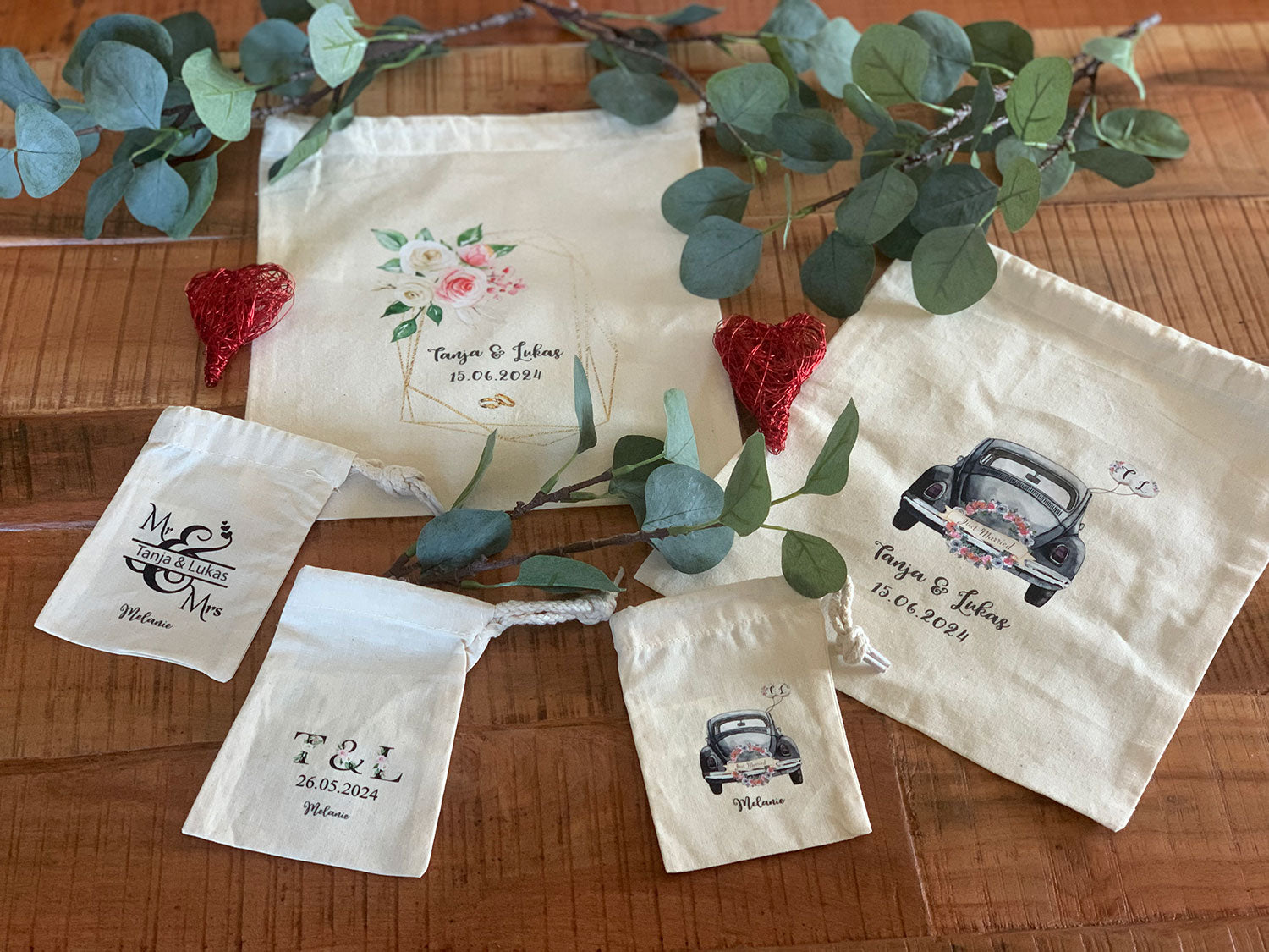 Mit unserer modernen DTF-Drucktechnologie hast du die Möglichkeit, jeden Beutel nach deinem Geschmack zu gestalten. Wähle aus einer Palette von vorgefertigten, liebevoll gestalteten Motiven und personalisiere sie mit Namen, Datum oder einer besonderen Botschaft. Egal, ob du ein kleines Dankeschön für die Gäste oder eine größere Verpackung für das besondere Hochzeitsgeschenk suchst - unsere Beutel sind in verschiedenen Größen erhältlich, um jedem Bedarf gerecht zu werden.