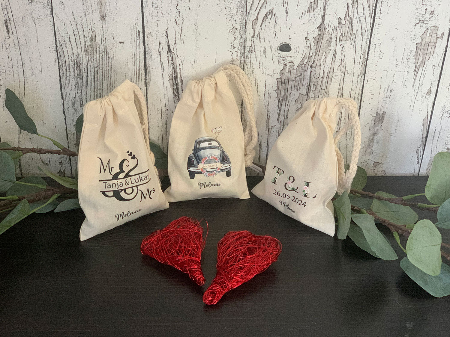 Unsere Hochzeitsbeutel aus feinster Baumwolle sind die perfekte Wahl, um Hochzeitsgeschenke stilvoll und mit einer persönlichen Note zu präsentieren. Sie dienen nicht nur als ästhetische Geschenkverpackung, sondern auch als bleibende Erinnerung an diesen besonderen Tag.