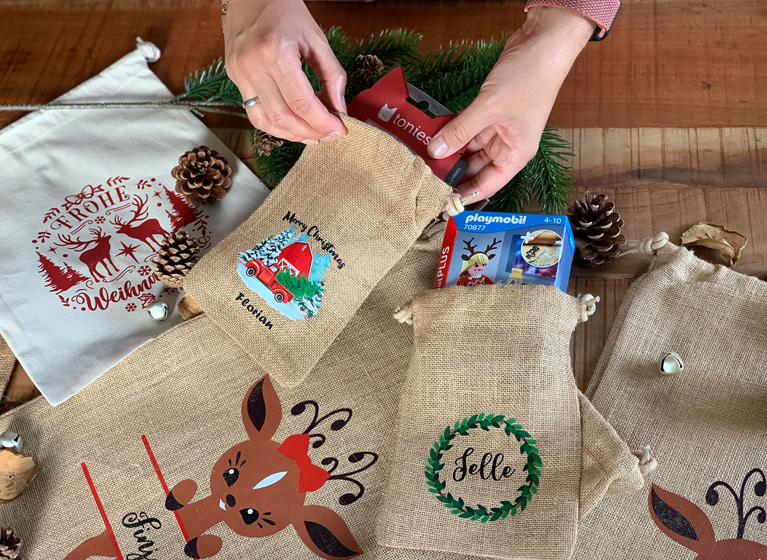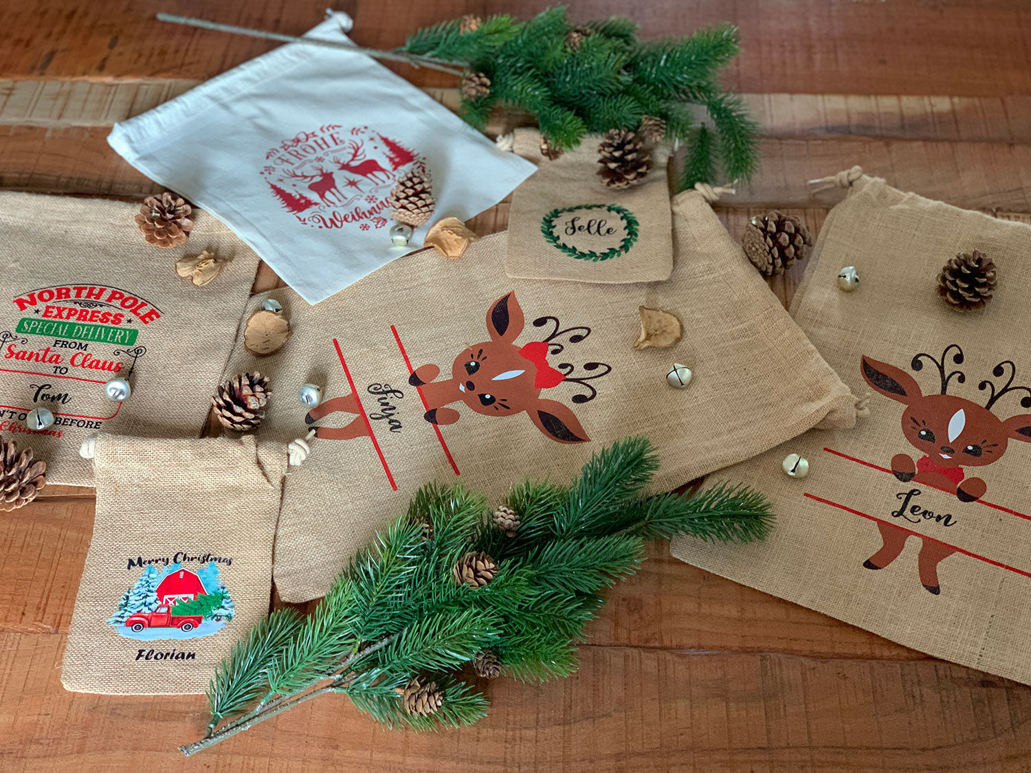 Unsere Weihnachtsbeutel aus Baumwolle oder Jute bieten eine nachhaltige und stilvolle Möglichkeit, deine Geschenke liebevoll zu verpacken. Sie schützen nicht nur den Inhalt, sondern verleihen jedem Präsent auch eine ganz persönliche Note, die zeigt, wie viel Gedanken und Liebe du in deine Geschenkauswahl gesteckt hast.